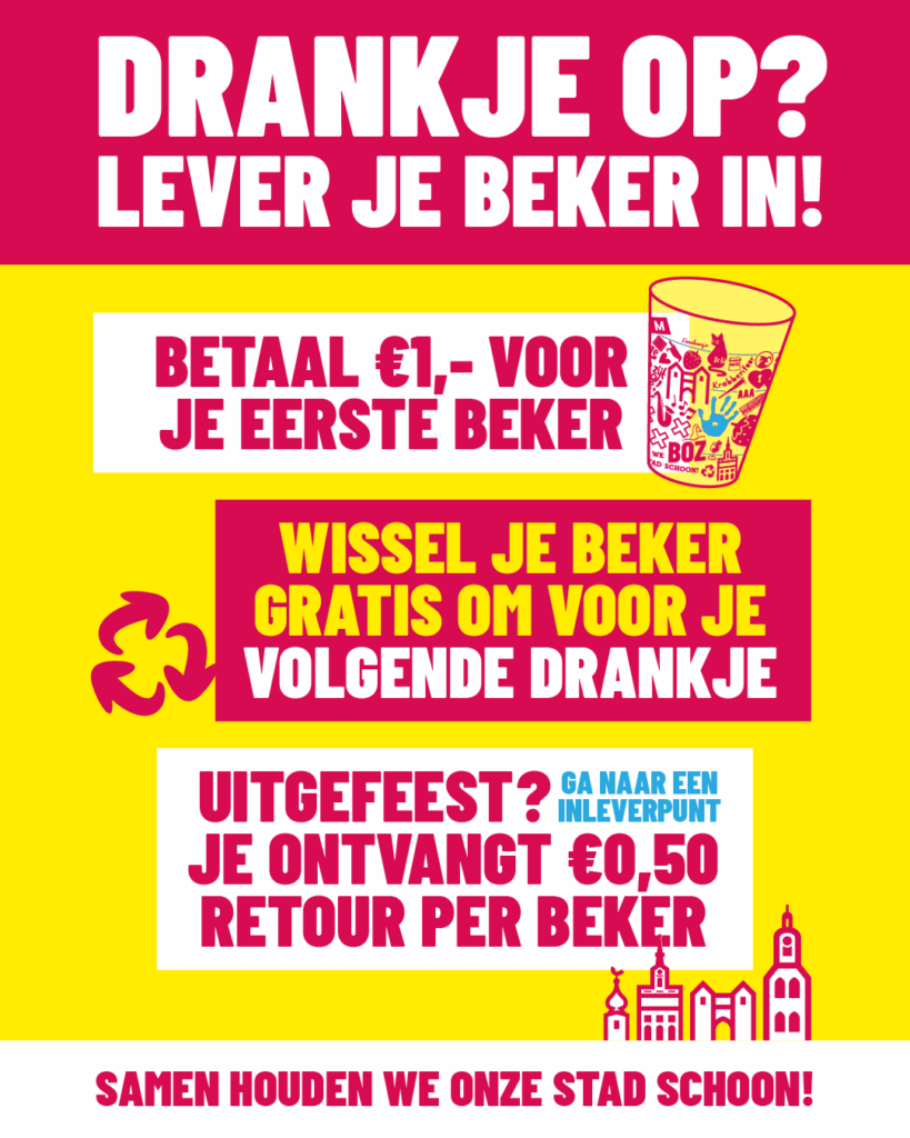 Sinds de editie van 2023 maken wij gebruik van ‘GREENCUPS’. In 2026 zal de beker anders zijn, maar het proces (bijna) hetzelfde. Dit jaar geen Greencup, maar de beker die de gehele stad gebruikt (zoals bij de Vastenavend). Neem hem dus mee van huis of koop hem aan de bar. Hieronder nog wel een korte uitleg
